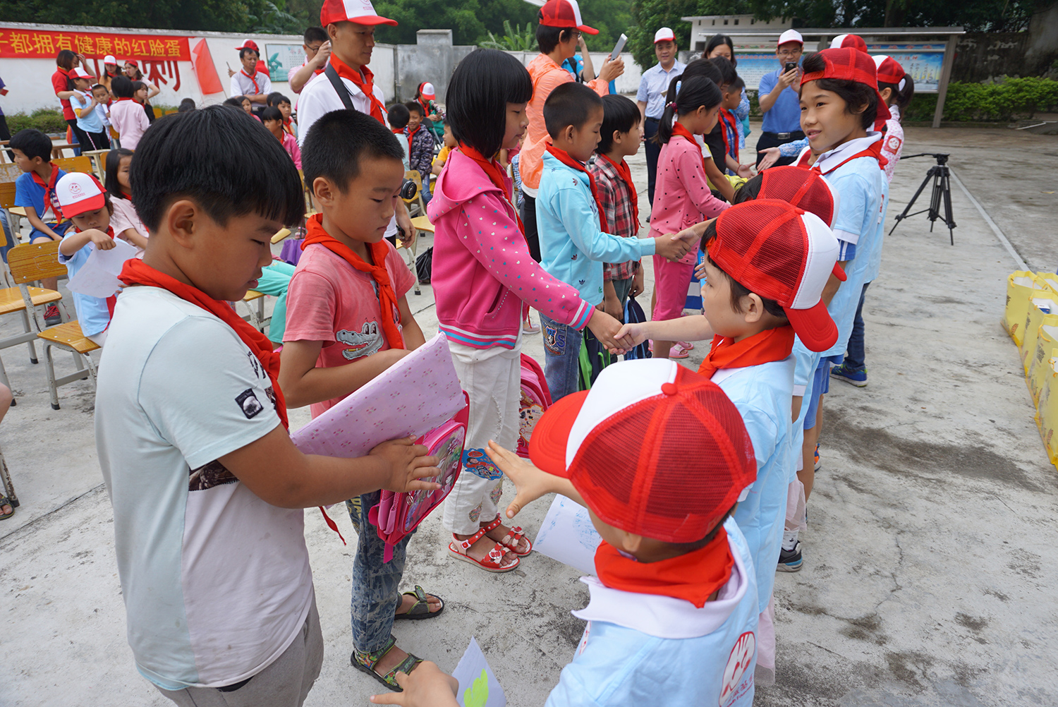 學(xué)校學(xué)生為遠(yuǎn)道而來的小客人戴上紅領(lǐng)巾,并相互握手問好。