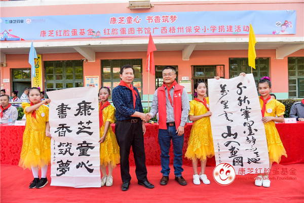 隨后,康芝藥業(yè)向卒錦坤校長贈送了“愛心共建學(xué)?!迸曝?;康芝藥業(yè)副總裁李幽泉先生給學(xué)校送上了“康芝童心 書香筑夢”、“千秋筆墨驚天地 萬里云山入畫圖”兩幅書畫作品;康芝工會給孩子們帶來了一批體育用品;康芝藥業(yè)梧州代理商及診所團(tuán)隊(duì)還給孩子們送上了書包、文具等文體用品。