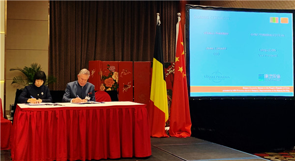 △康芝藥業(yè)副董事長兼副總裁洪麗萍(左)與Vésale Pharma公司董事長Jehan Lienart(右)簽署協(xié)議