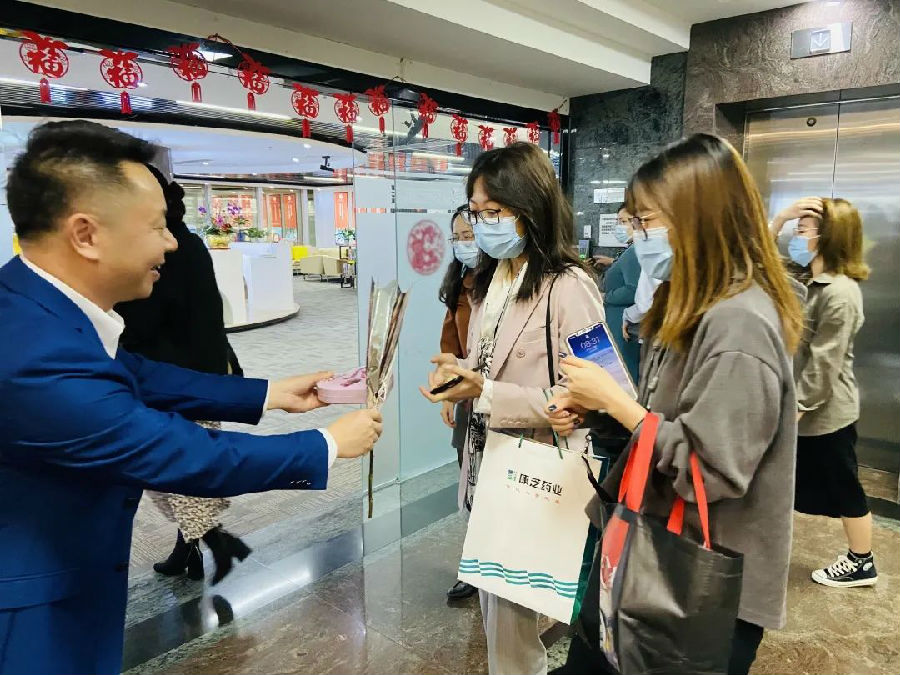 收到鮮花禮物的女神們一臉的歡喜,笑得特別開心。一位收到玫瑰的女員工開心地感慨道:“公司每年都記著,很感動(dòng),也很開心!”