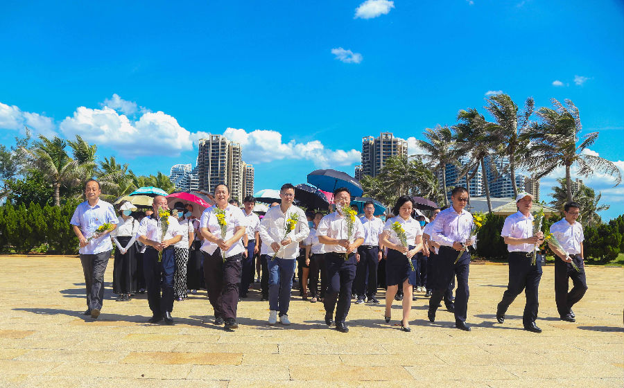 在海南臨高角解放公園,來自康芝藥業(yè)黨支部攜手華夏銀行海口分行黨委的全體黨員干部、預(yù)備黨員、入黨積極分子在革命烈士紀(jì)念碑下敬獻(xiàn)花束,對(duì)烈士表示崇高敬意。