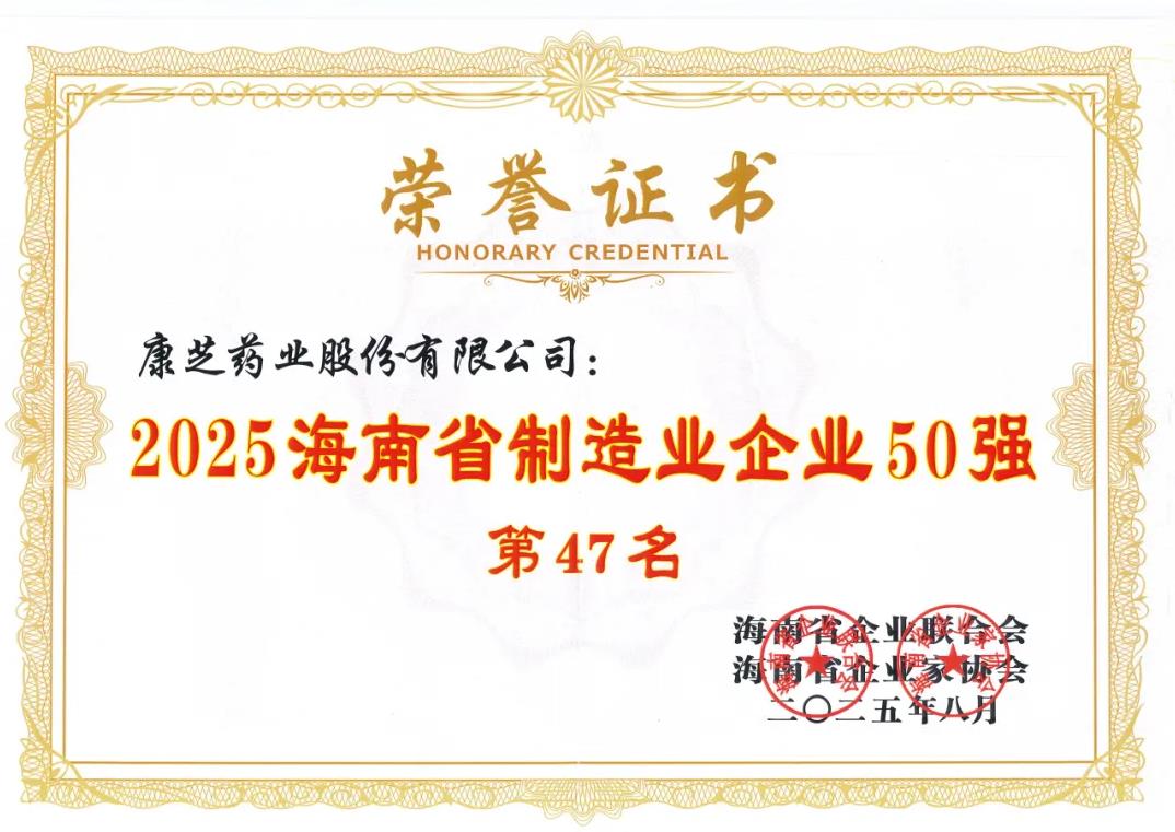 本次康芝藥業(yè)榮登“2025海南制造業(yè)企業(yè)50強”榜單,不僅是社會各界對公司綜合實力的認可,更是對公司未來發(fā)展的激勵和鞭策。