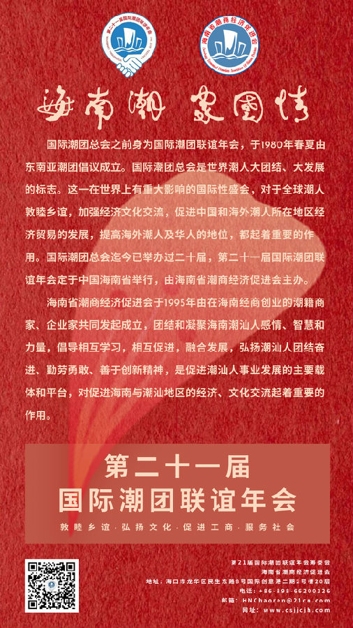 第21屆國際潮團聯(lián)誼年會將于12月3日至12月5日在博鰲亞洲論壇國際會議中心召開,本屆年會也是繼汕頭、北京、廣州、武漢之后第五次在中國內地召開、首次在海南召開。